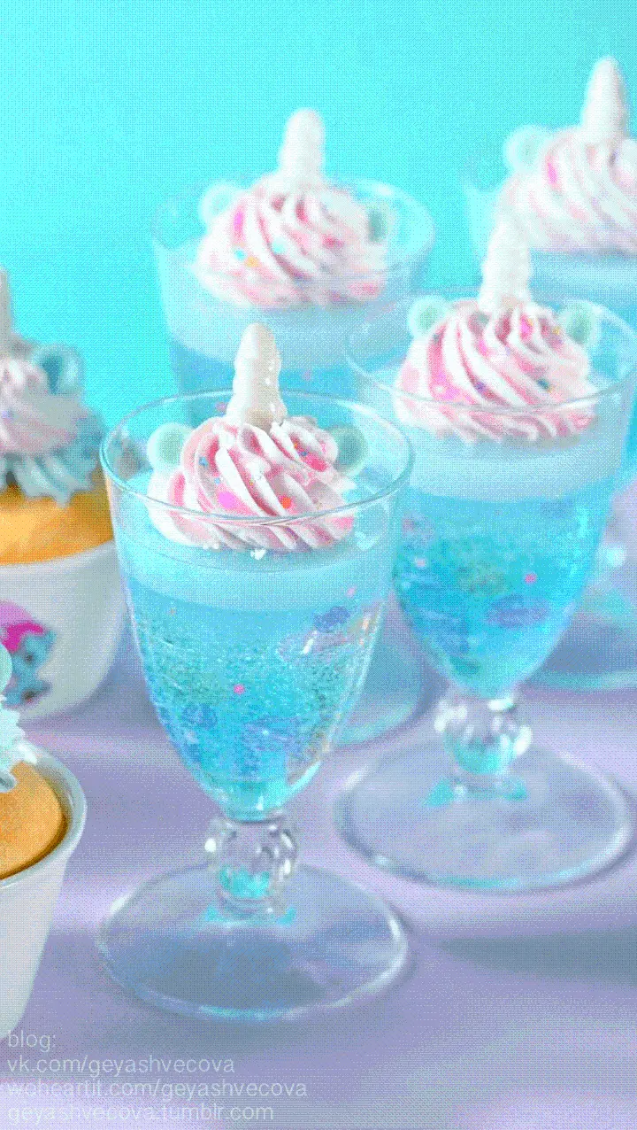 تصویر رویایی بستنی لیوانی های آبی اکلیلی با طرح اسب تک شاخ در دریا