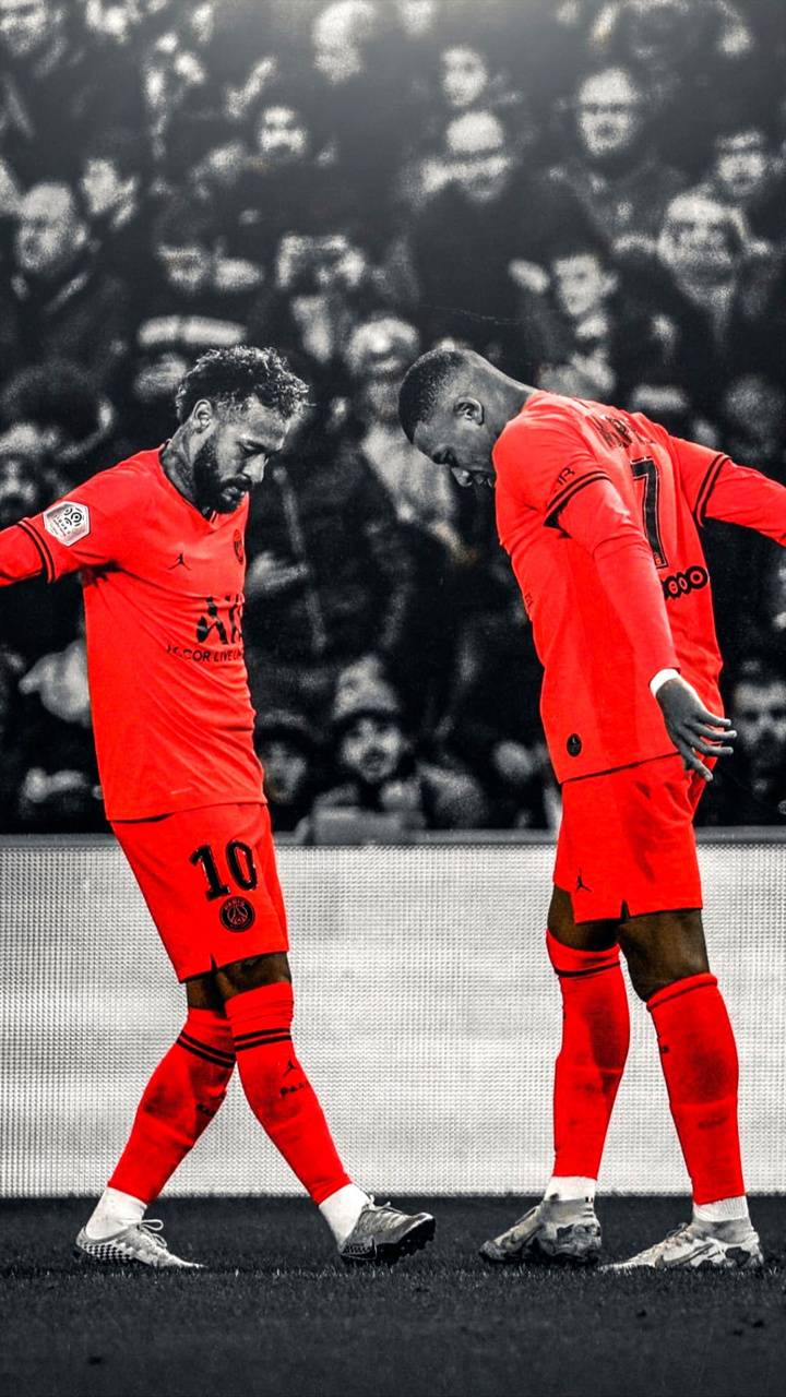 دانلود تصویر استوک از نیمار و امباپه در حال خیرە شدن بە جلو و با لباس قرمز گوجەای