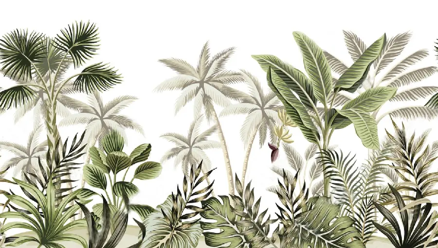 والپیپر جذاب نقاشی هنرمندانه از درخت موز و آسمان و کبوتران