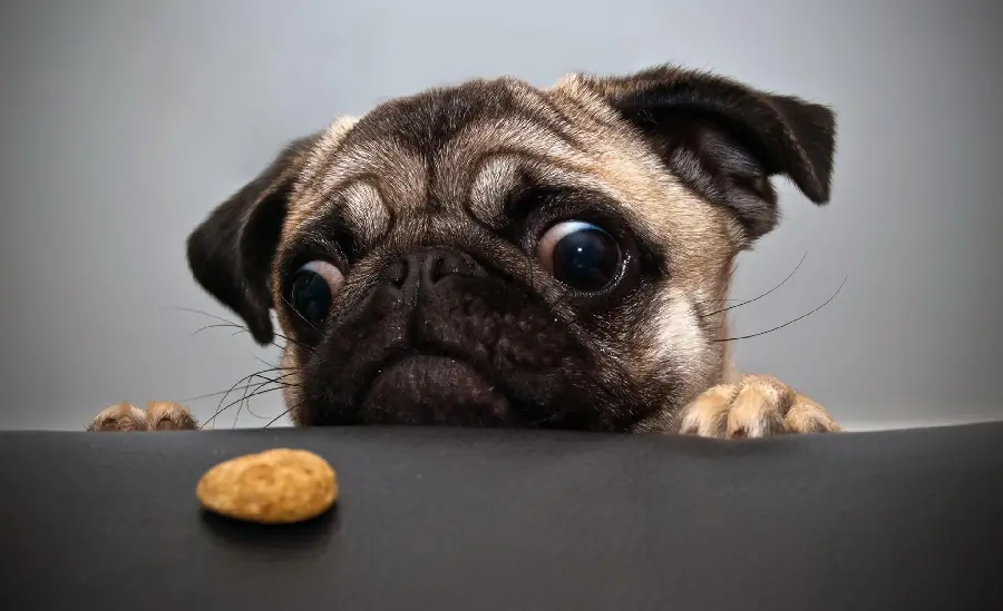 تصویر بامزه سگ نژاد بولداگ در حال نگاه متعجانه به غذا