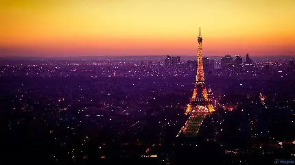 عکس برج ایفل دیدنی در شب و قلب شهر پاریس مهد فرهنگ با آسمان نارنجی و زرد رنگ باکیفیت hd
