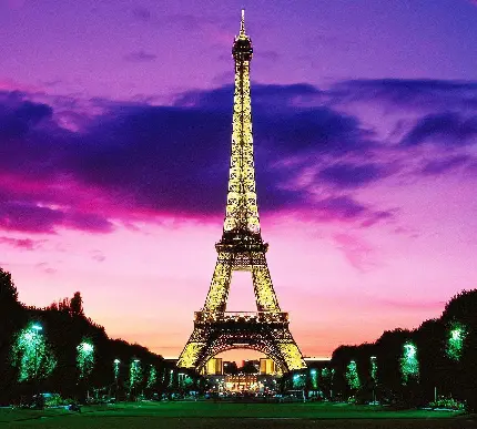 دانلود تصویر زمینە مرتب و تمیز از درختچەهای کنار برج ایفل و آسمان چند رنگ شب در پاریس مهد فرهنگ فرانسە
