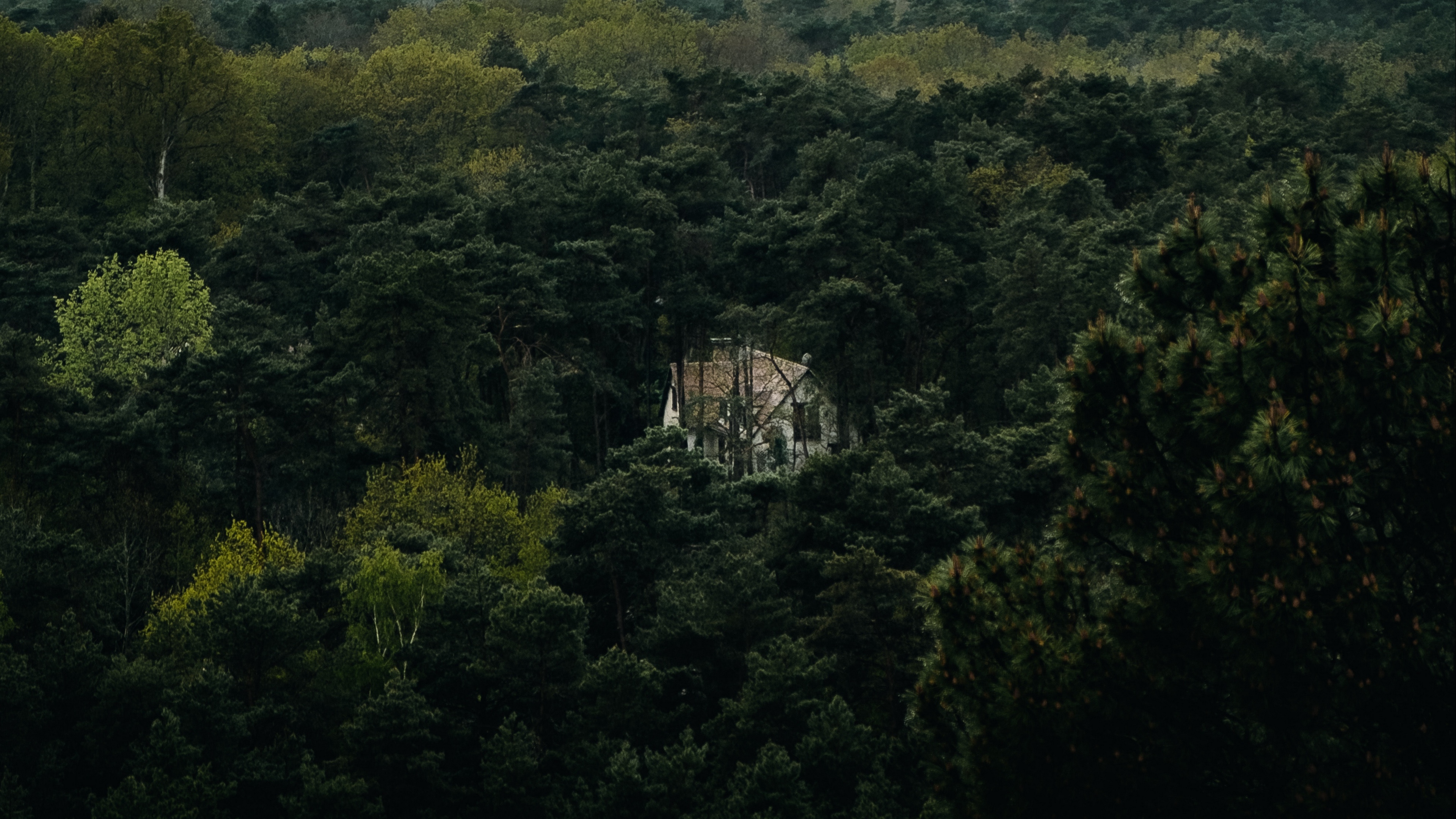 بک گراند رویایی از خانه جنگلی در کوه پر از درختان سر سبز با کیفیت 4K