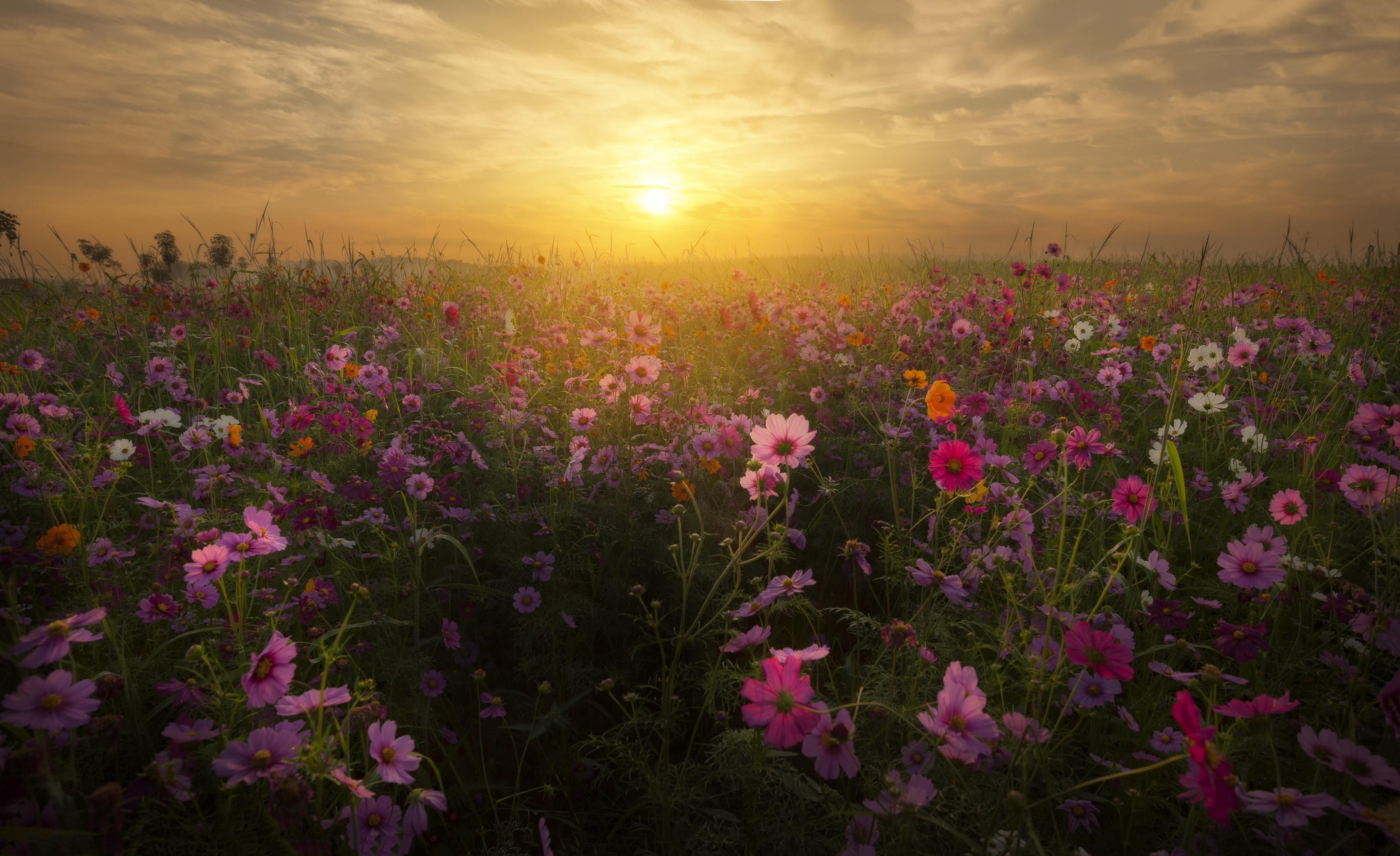 غروبی دل انگیز خورشید و باغ پر از گل های رنگی رنگی