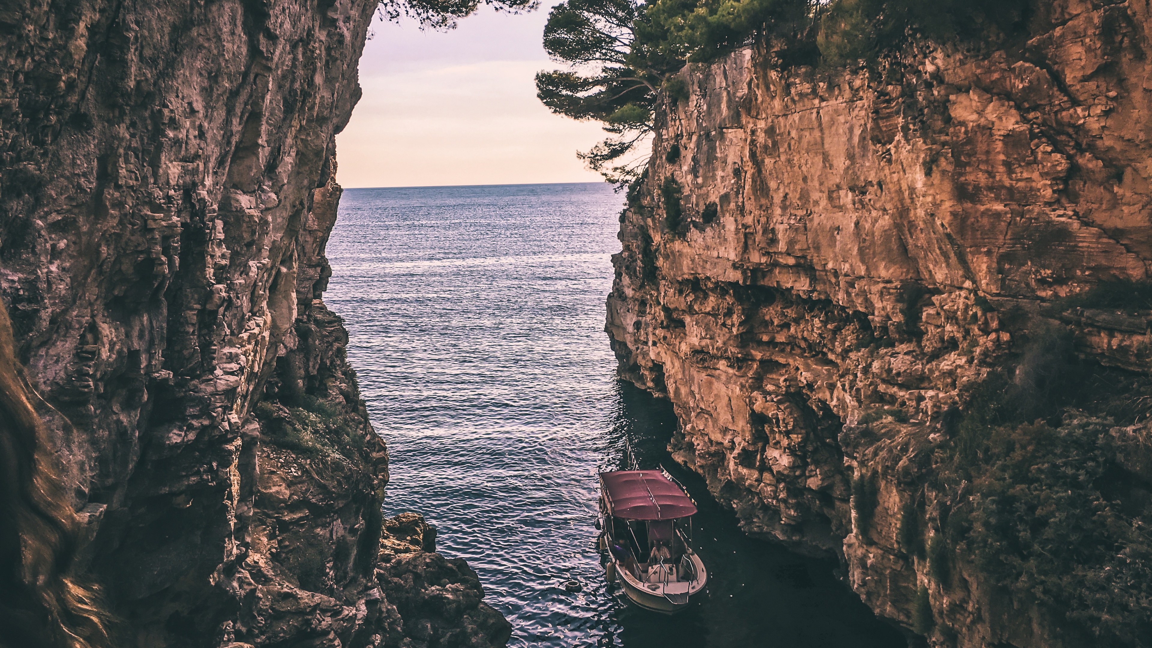پست هنری قایق کوچک میان دو صخره در دریا برای instagram