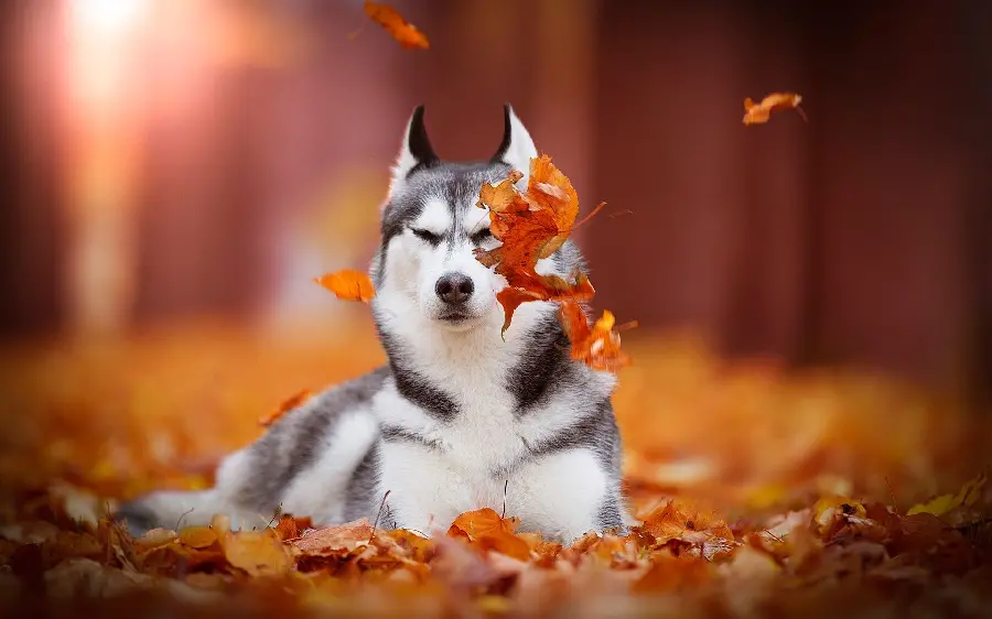 بک گراند هاسکی با پشت زمینه برگ های قرمز و نارنجی پاییز