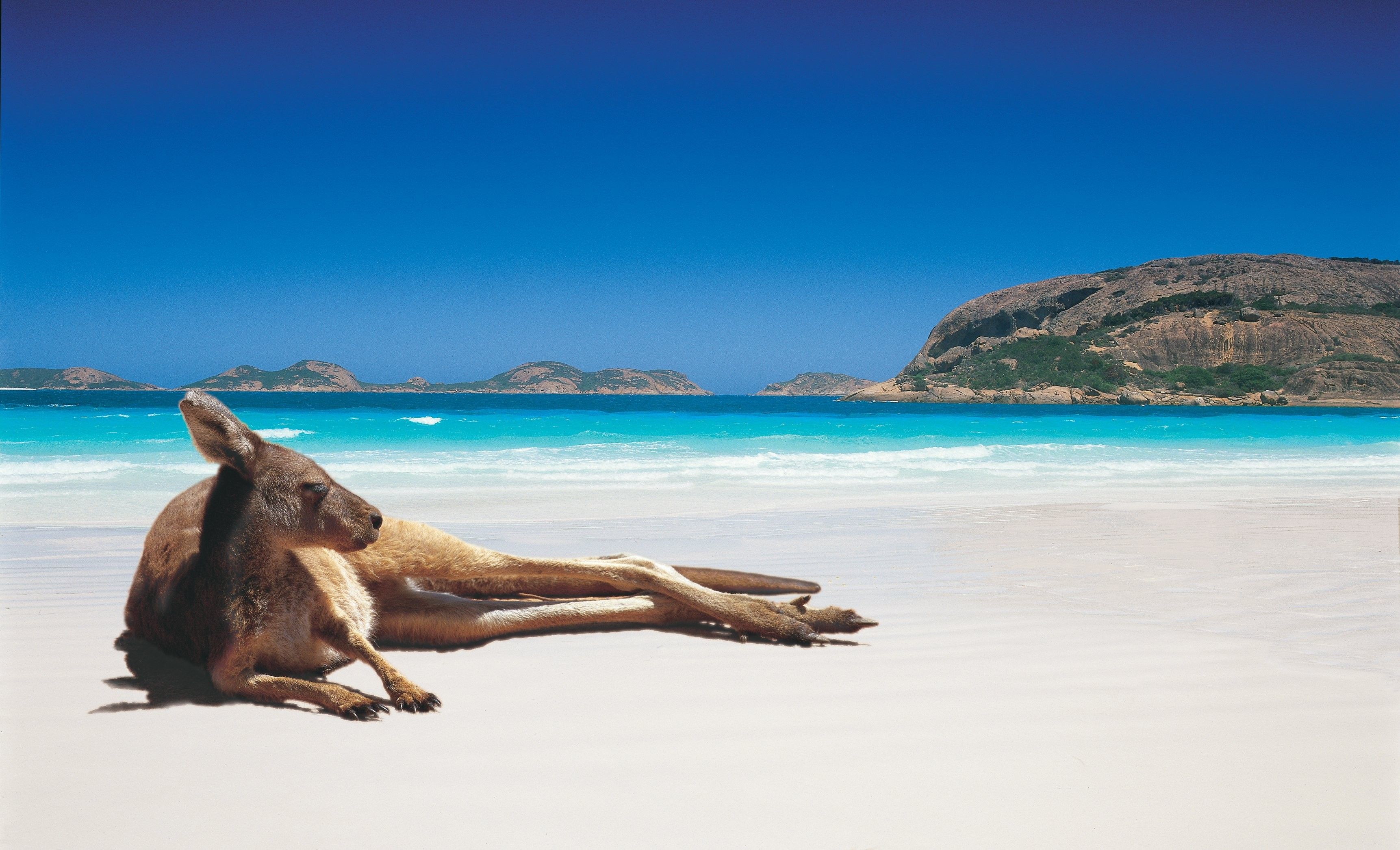 برترین پس زمینه از کانگوروی شاداب در ساحل با شنهای سفید