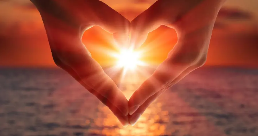 تصویر خلاقانه از قلب با دست رمانتیک 4K در بکگراند غروب