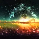 والپیپر درخت زندگی واقع در آب در کنار صندلی با آسمانی پر ستاره و رنگین