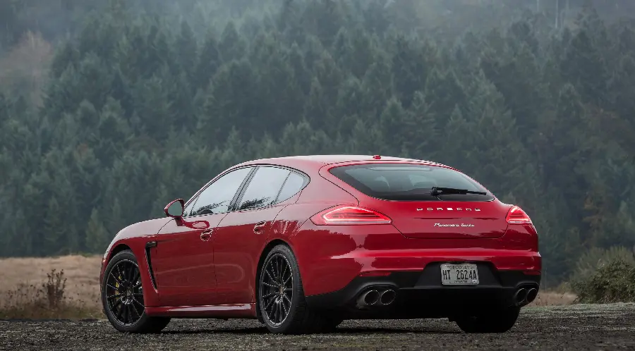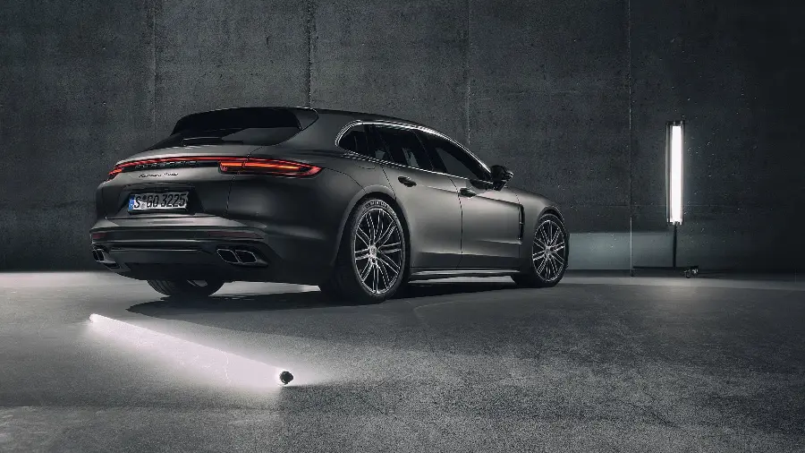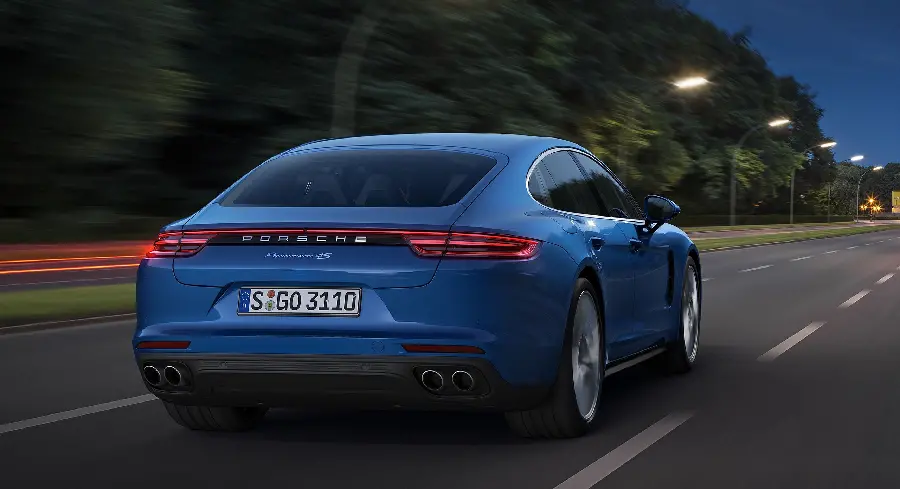بک گراند اتومبیل پورشه پانامرا سیاه از نمای پشت با چهار اگزوز اسپرت