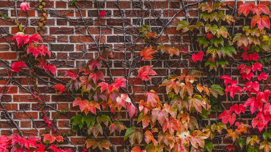 والپیپر بسیار جذاب برگ های پاییزی زیبا روی دیوار آجری