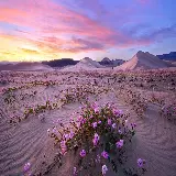 تصویر زمینه جذاب از طلوع آفتاب در دشتی پر از گل های ارغوانی