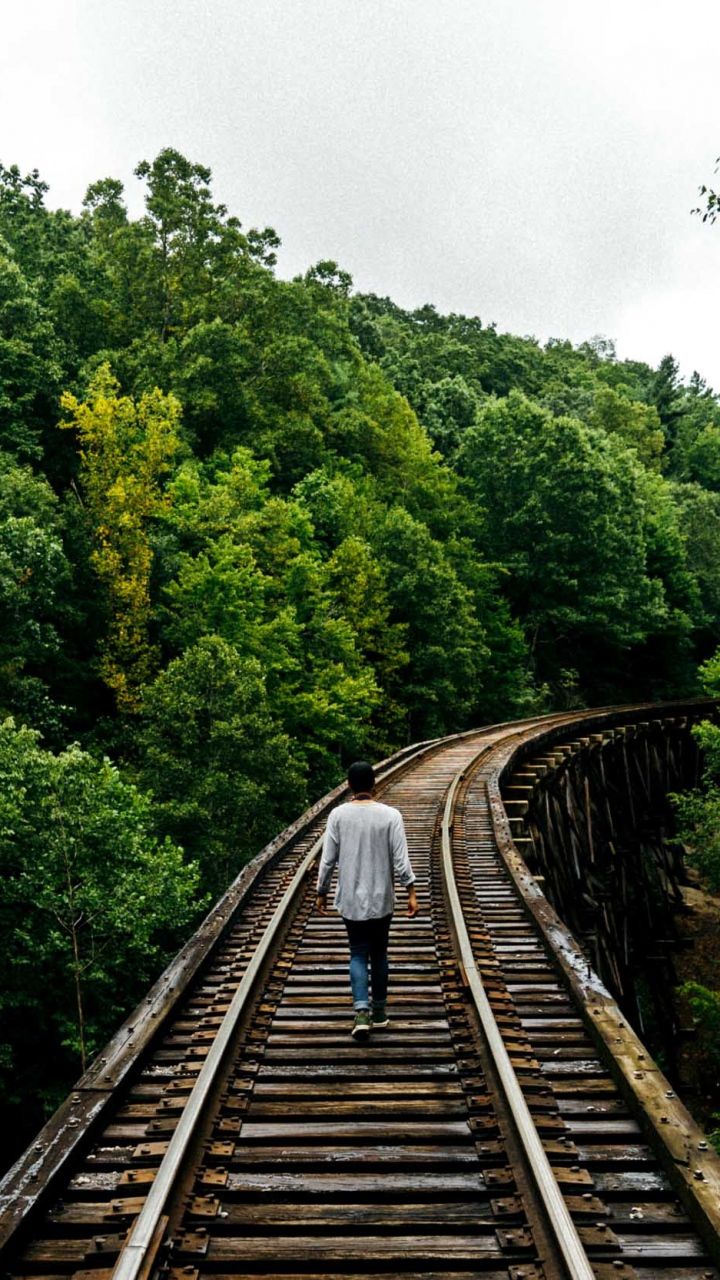 عکس مرد تنها در حال دویدن روی ریل راه آهن در کنار درختان