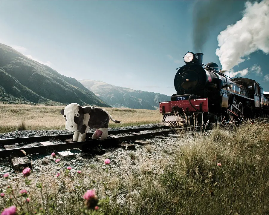 بک گراند گوگولی ساختگی از بچه گاو زیبا در مسیر ریل قطار