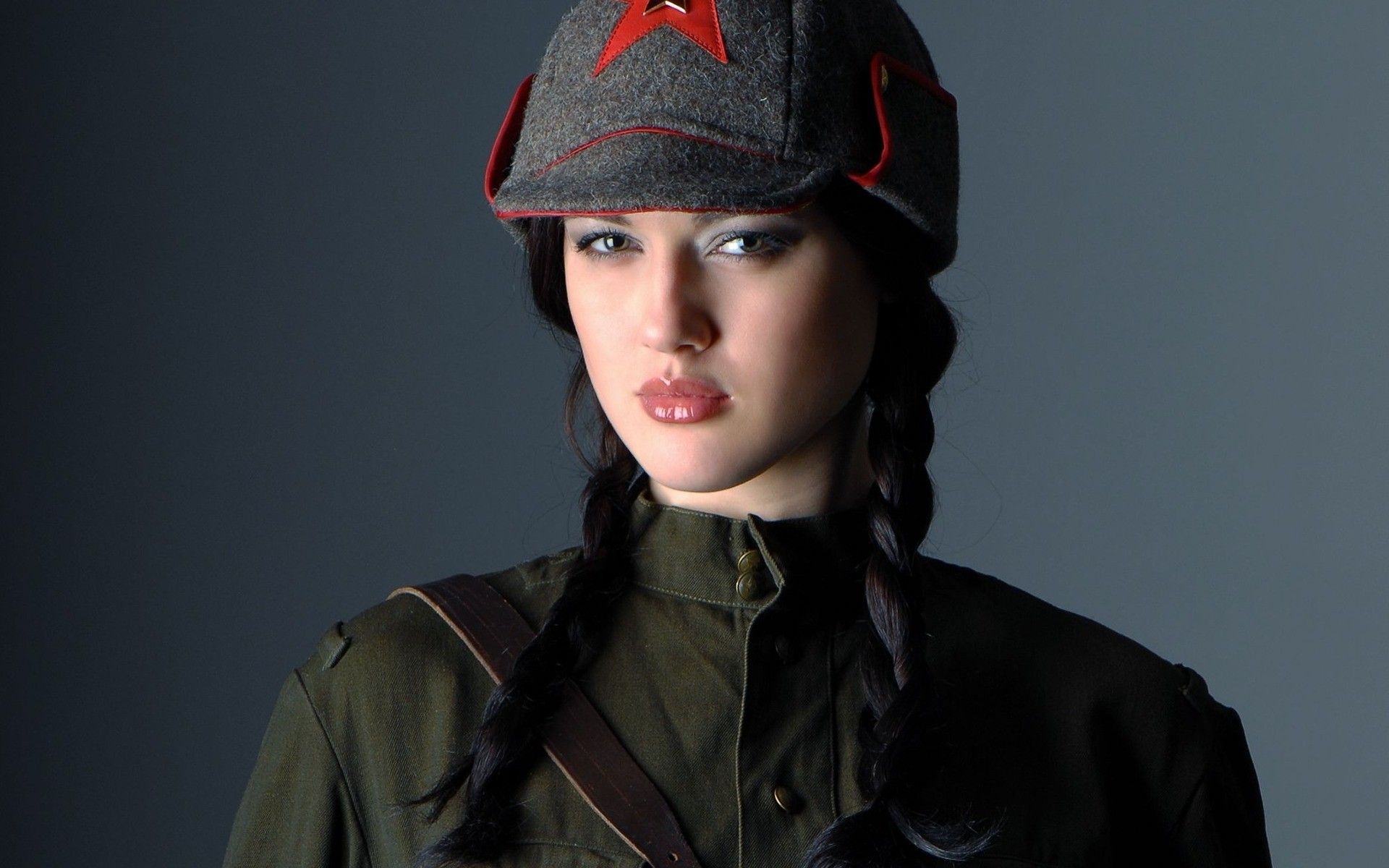 دانلود عکس استوک پر طرفدار از دختری با لباس نظامی سبز و کلاە مشکی رنگ ستارەدار قرمز و گیسوان مشکی