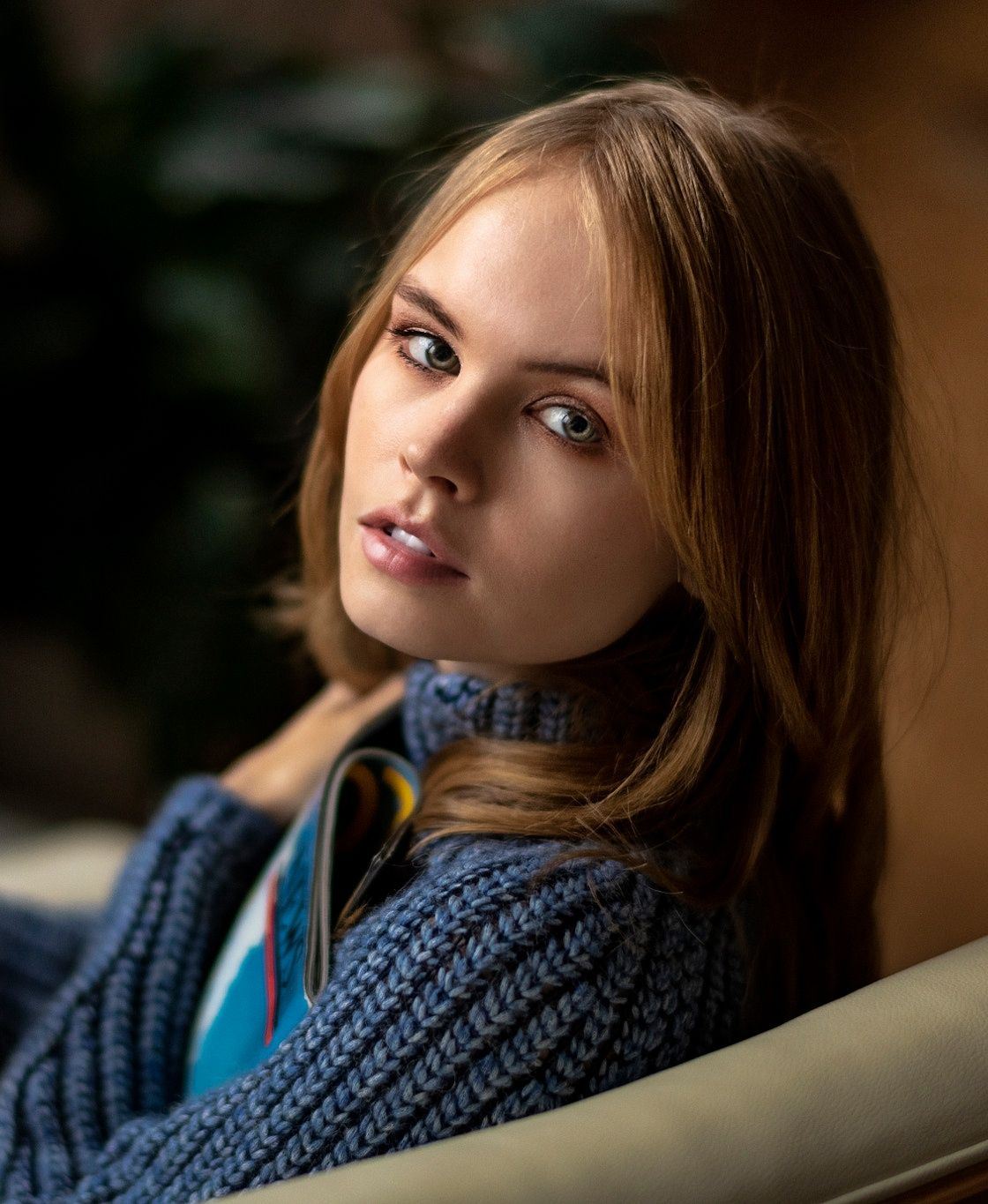برترین والپیپر گوشی اپل باکیفیت HD از دختر روسی مو بلوند چشم خوشگل با لباس بافت سفید رنگ