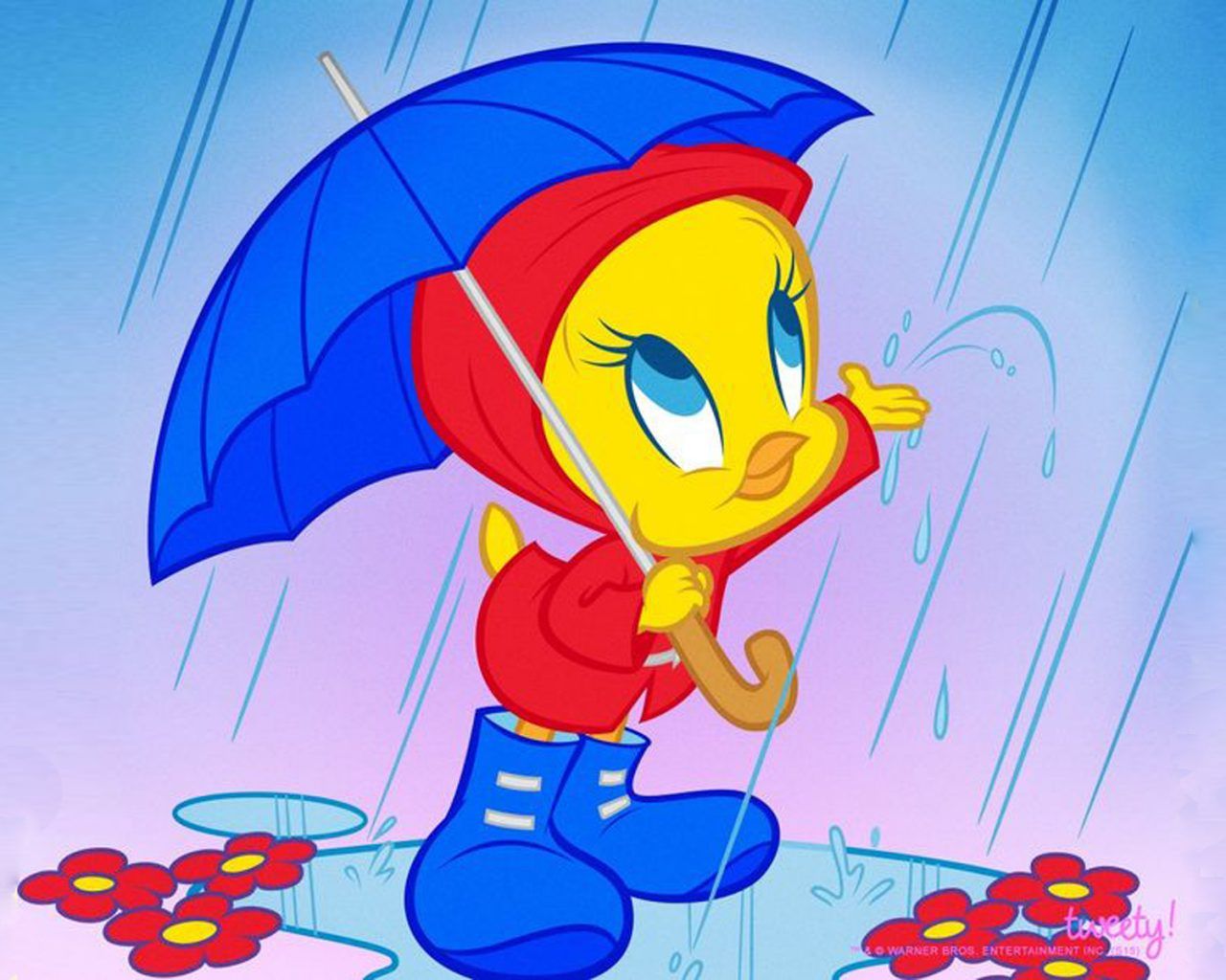 عکس کارتونی جوجه اردک زرد بامزه با چتر آبی در باران