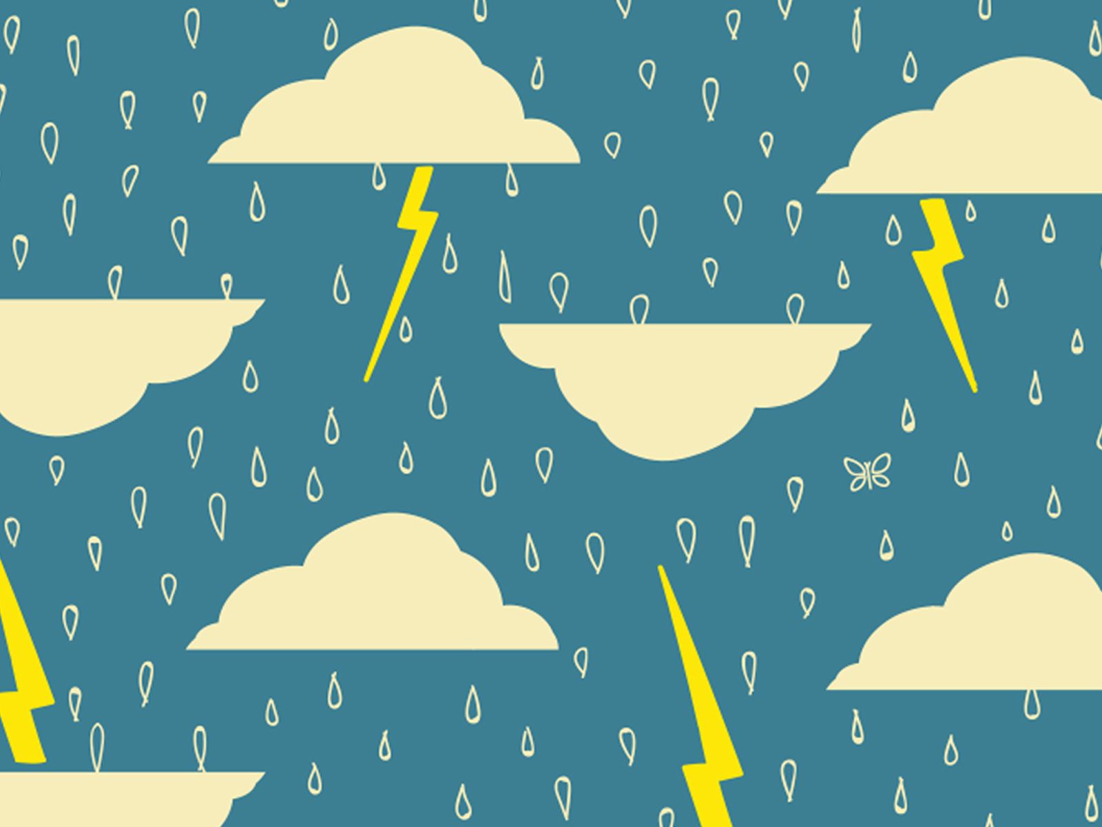 عکس کارتونی ابر و باران و رعدوبرق در آسمان سبز آبی
