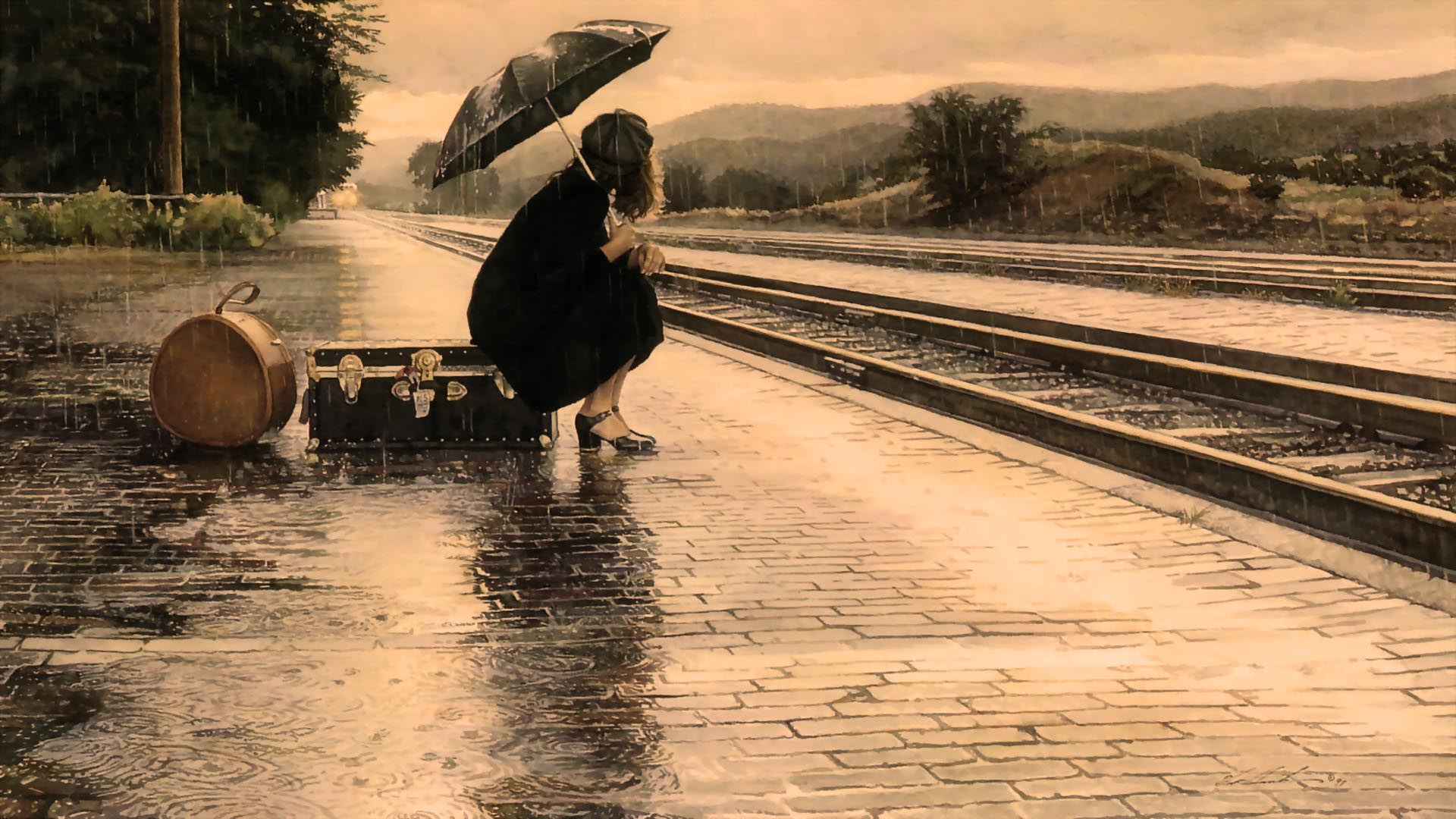 عکس غمگین دختر تنها در ایستگاه قطار زیر باران با چتر