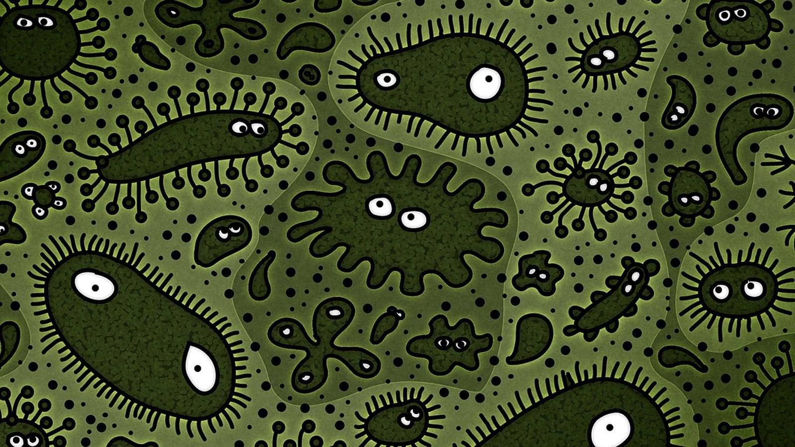 تصویر کارتونی میکروب ها در بکگراند سفید مربوط به میکروبیولوژی
