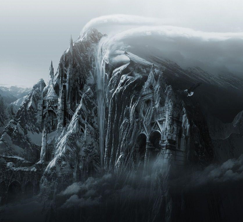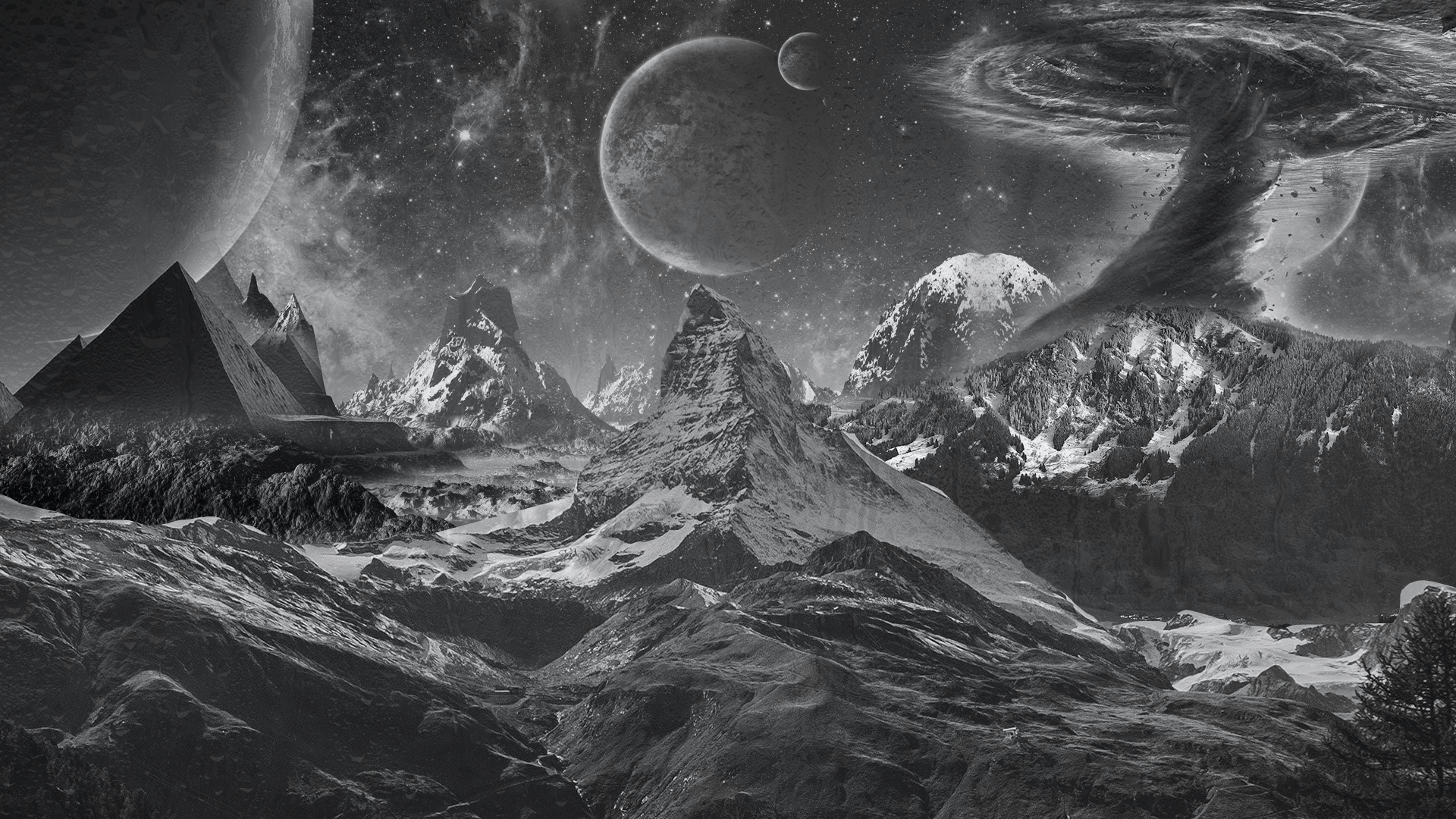 عکس دیجیتال از منظره کوه و آسمان سبک سورئال تاریک به رنگ سیاه و سفید