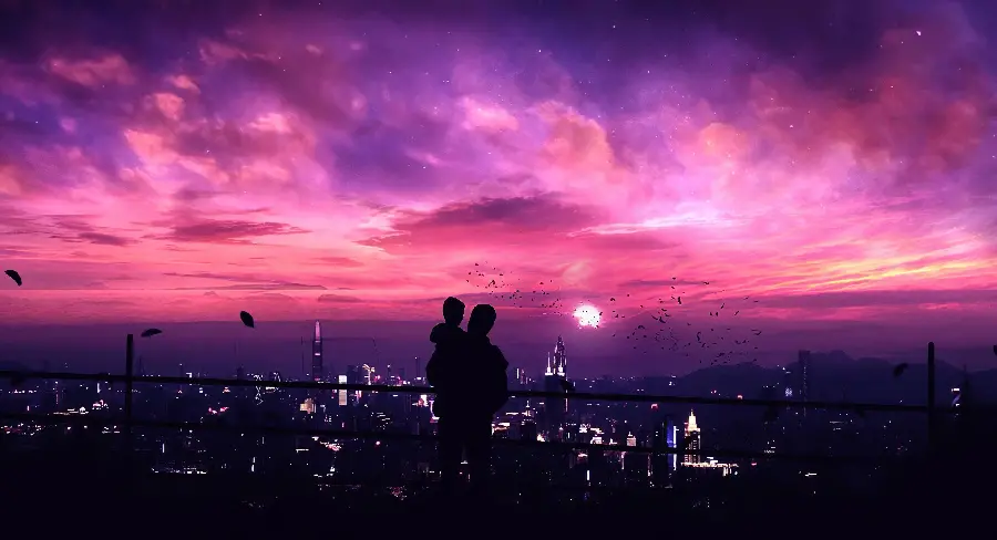 عکس نقاشی پدر و پسر هنگام تماشای غروب آفتاب در کنار هم