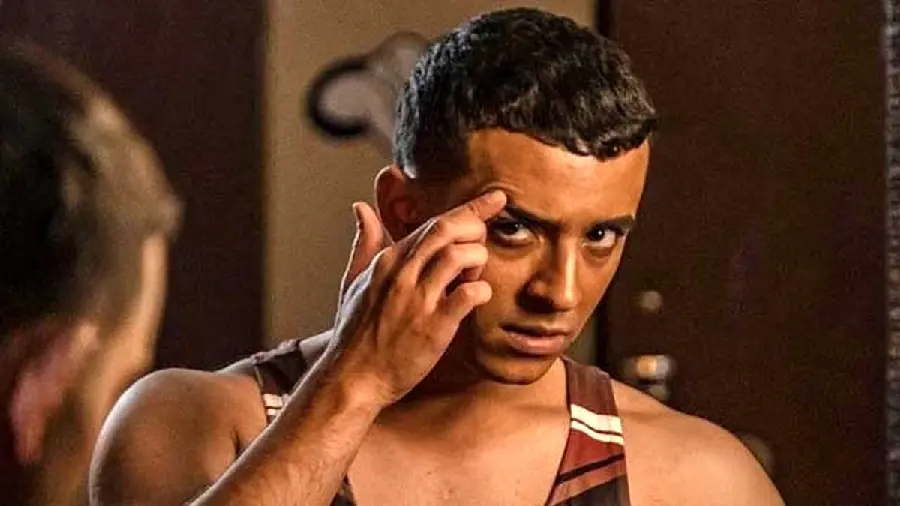بک گراند جاوید در یاغی در حال نگریستن به آینه با انگشت دستش روی ابرویش