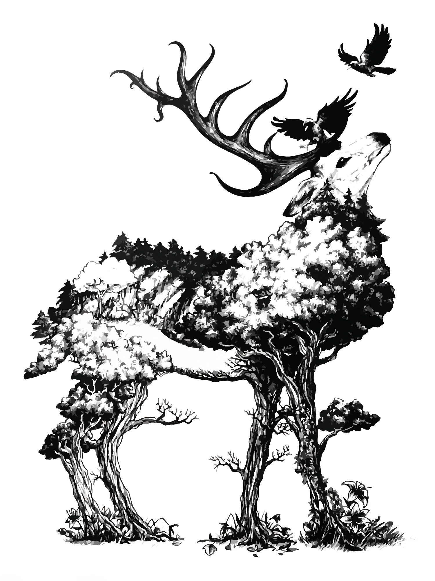 تصویر png نقاشی حرفه ای و هنری گرافیکی گوزن در کنار درخت بی برگ