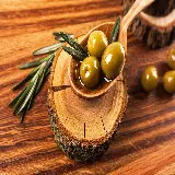 دانلود عکس استوک خوشگل از سە زیتون در قاشق چوبی بر روی تنە چوب قهوەای