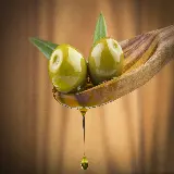تصویر فانتزی کیوت از دو دانەی زیتون با برگ همراە روغن درخشان در قاشقی در حال ریختە شدن