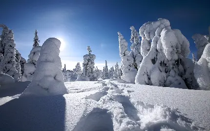 تصویر زمینه بسیار جالب و دیدنی زمستانه با درختان پر از برف و آسمان آبی