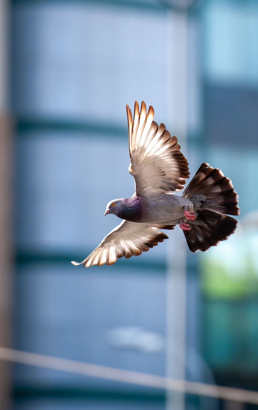 پوستری متداول از کبوتری که در حال پرواز با تابش نور آفتاب به بالهایش