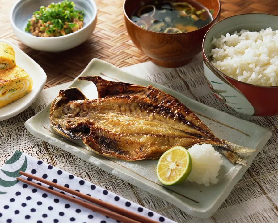 عکس غذای دریایی ماهی و سبزیجات در بشقاب