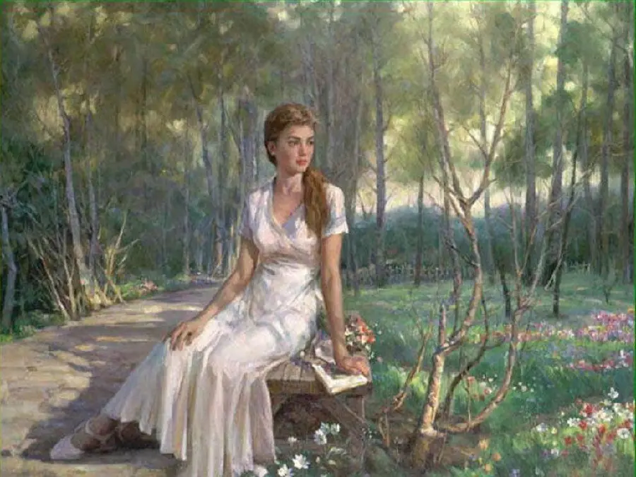 تصویر زنی نشسته روی نیمکت با لباس سفید در نقاشی سبک رمانتیسم