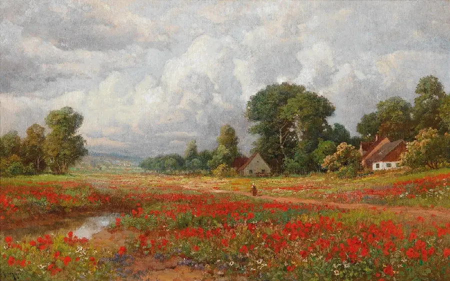 استوک نقاشی سبک رمانتیسم از دشت و گل های قرمز بسیار زیبا
