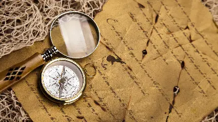عکس پس زمینه از نامه کاغذی قدیمی با ذره بین و قطب نما