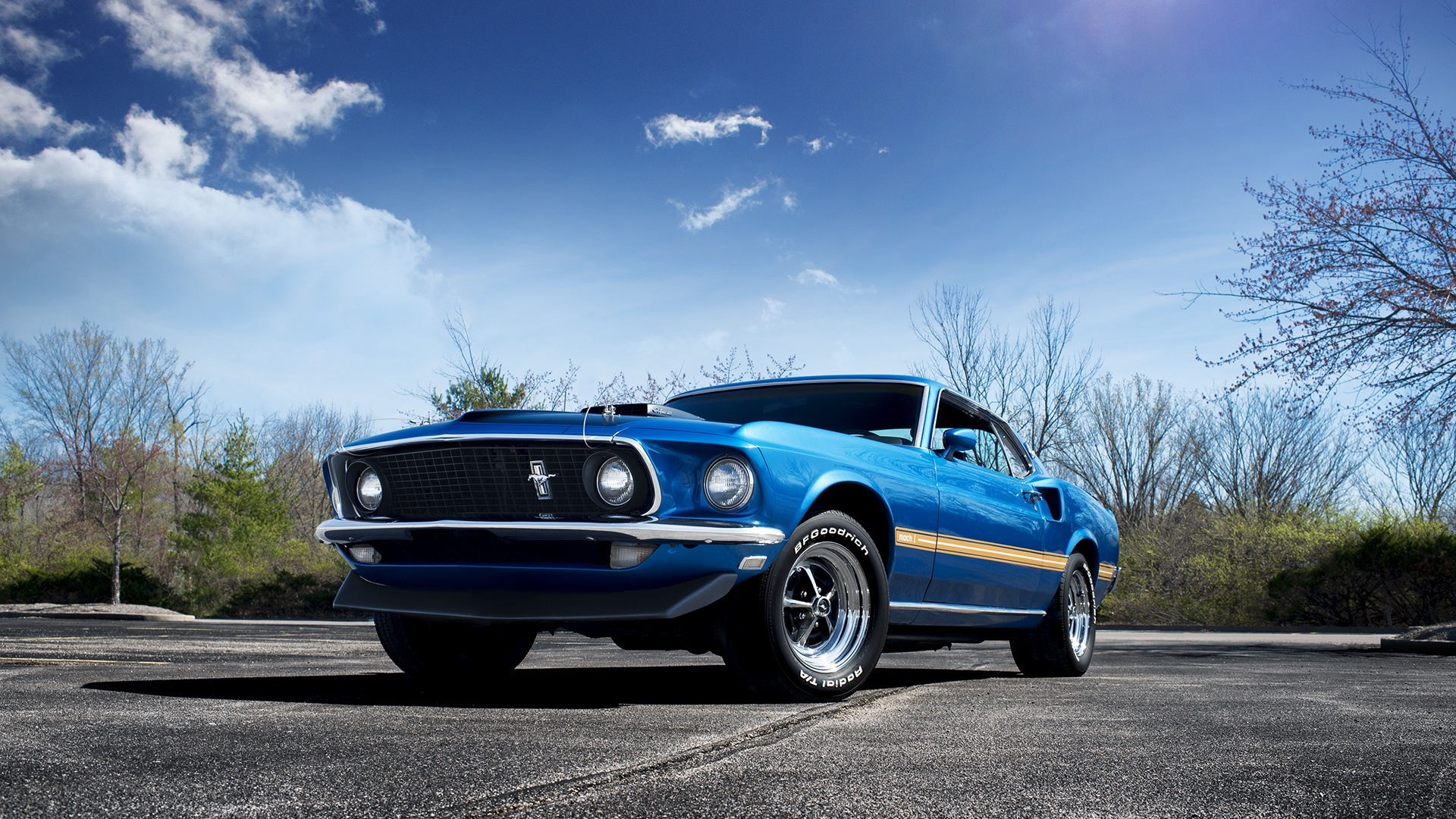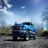 عکس نمایه شیک از ماشین آبی و کلاسیک در جاده جنگلی
