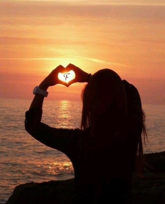 دانلود بک گراند قشنگ از دختری در کنار غروب ساحل کە با دست قلبی با حرف F درست کردە
