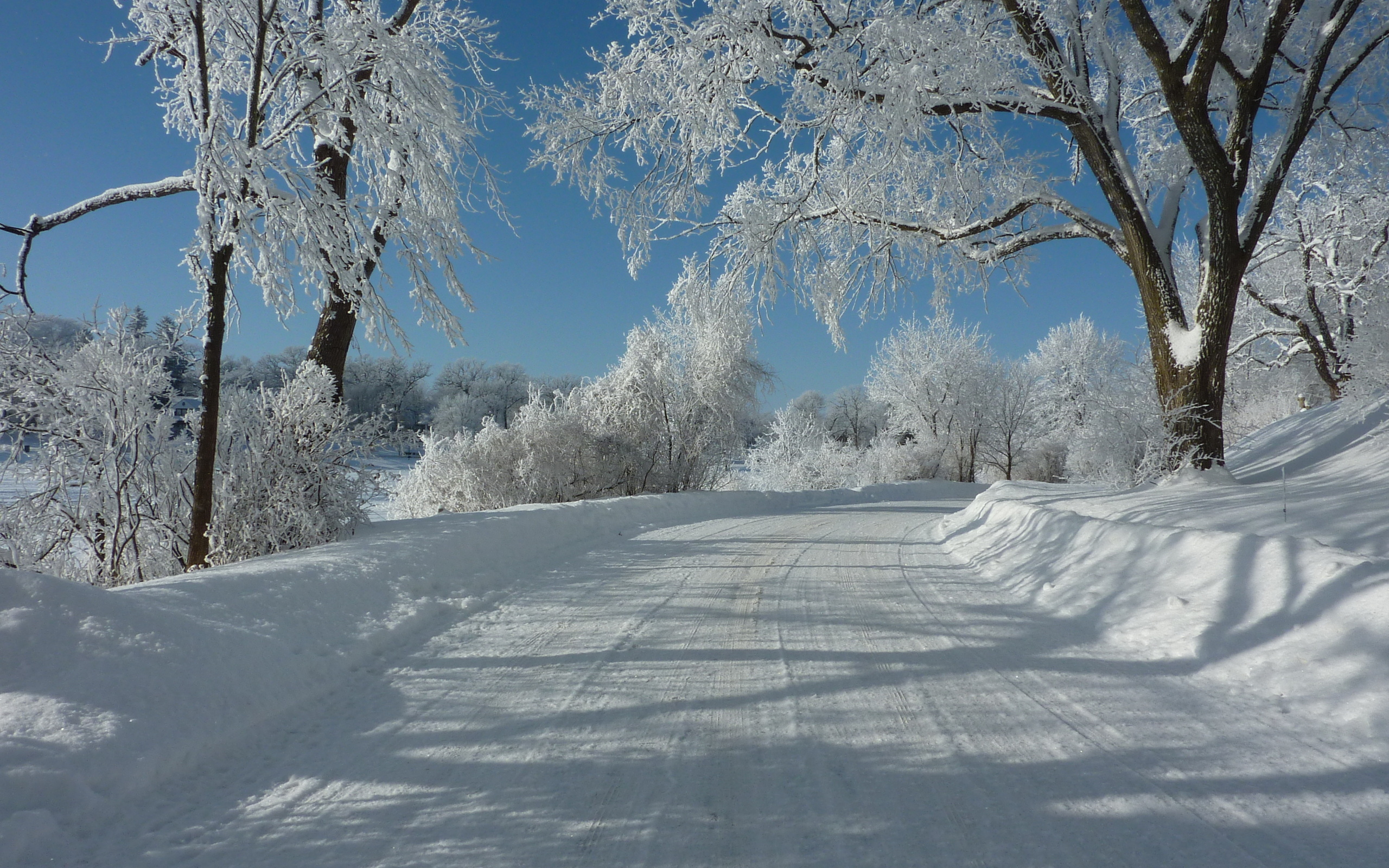بک گراند جاده برفی با درختان زیبا و آسمانی صاف