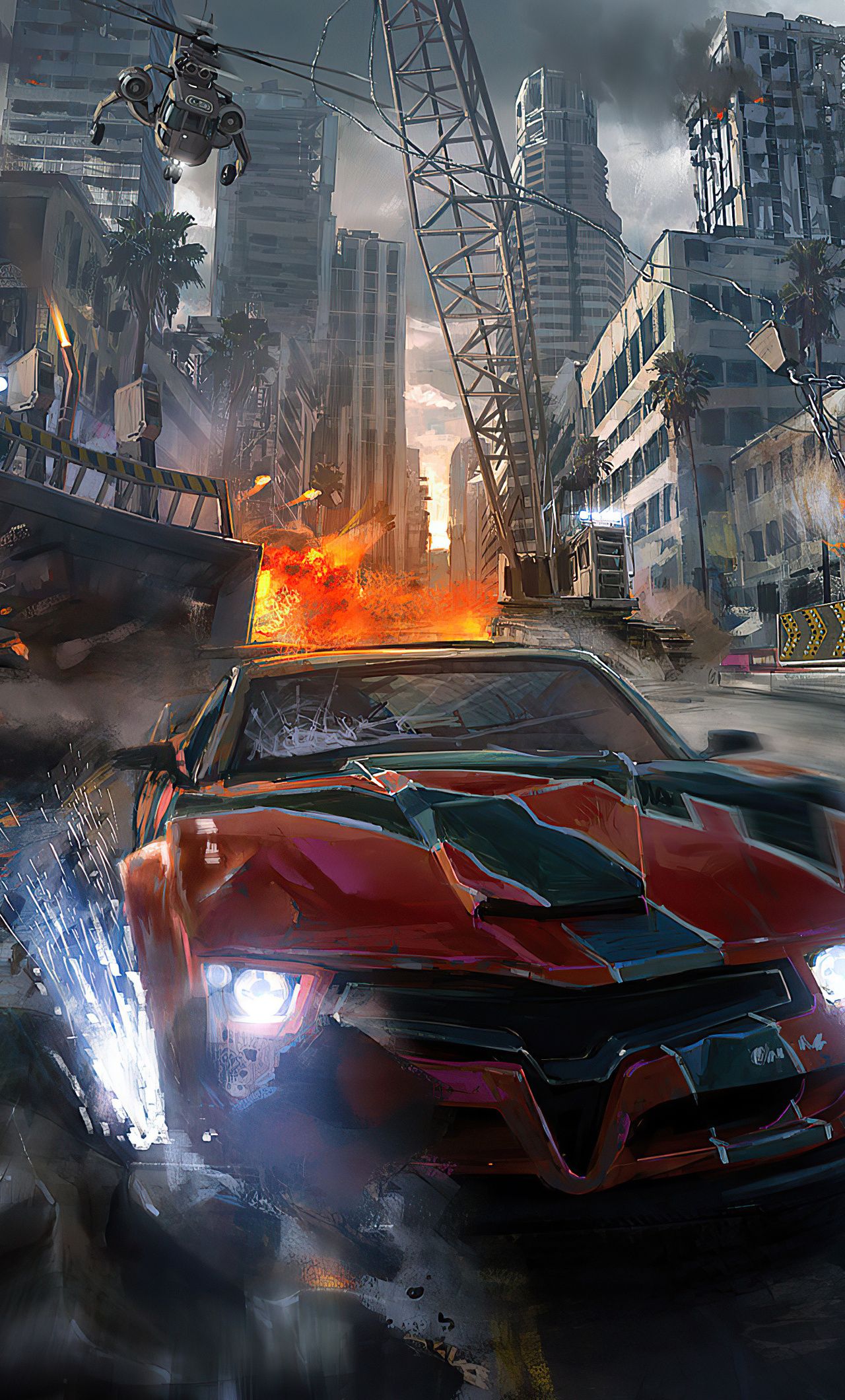 عکس جالب و دیدنی از ماشین قرمز در جاده با ساختمان های بلند کنار جاده