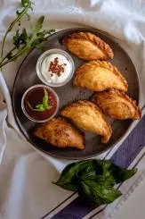 دیزاین شیک و ساده و استفاده از ایتم هایی مانند برگ و پس زمینه ی سفید توجه بیننده را بیشتر به سمت آیتم اصلی عکس یعنی پیراشکی ها جلب می کند.همچنین گذاشتن سس های متنوع در ظرف های کوچک کنار این نوع غذاها مثل پیراشکی و پیتزا و کلا فست فودها ، ایده ی بسیار خوبی است.پخت پیراشکی ها هم بسیار بی نقص است و اگر عکس تبلیغاتی می گیرید قطعا با ترکیب این اشپزی و عکاسی ،مشتری به سمتتان جذب می شود.