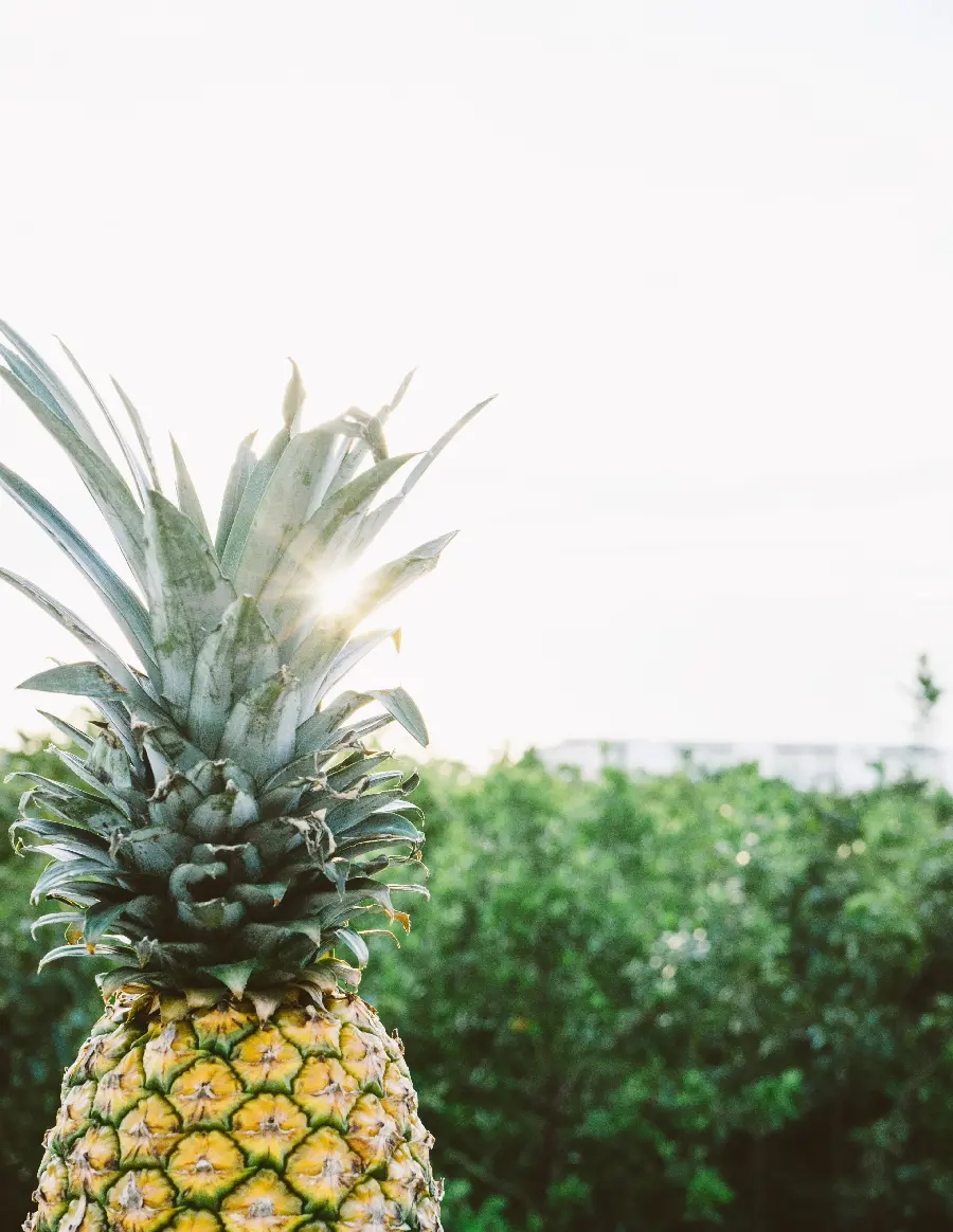 عکس با کیفیت بالا از آناناس با برگ سبز در مقابل باغ پر برگ که مناسب برای استفاده در پروژه های غذایی و طبیعت می باشد. این تصویر با رزولوشن فول اچ دی و کاملا رایگان قابل دانلود است. مناسب برای طراحی منو، کاور و تولید محتوا.