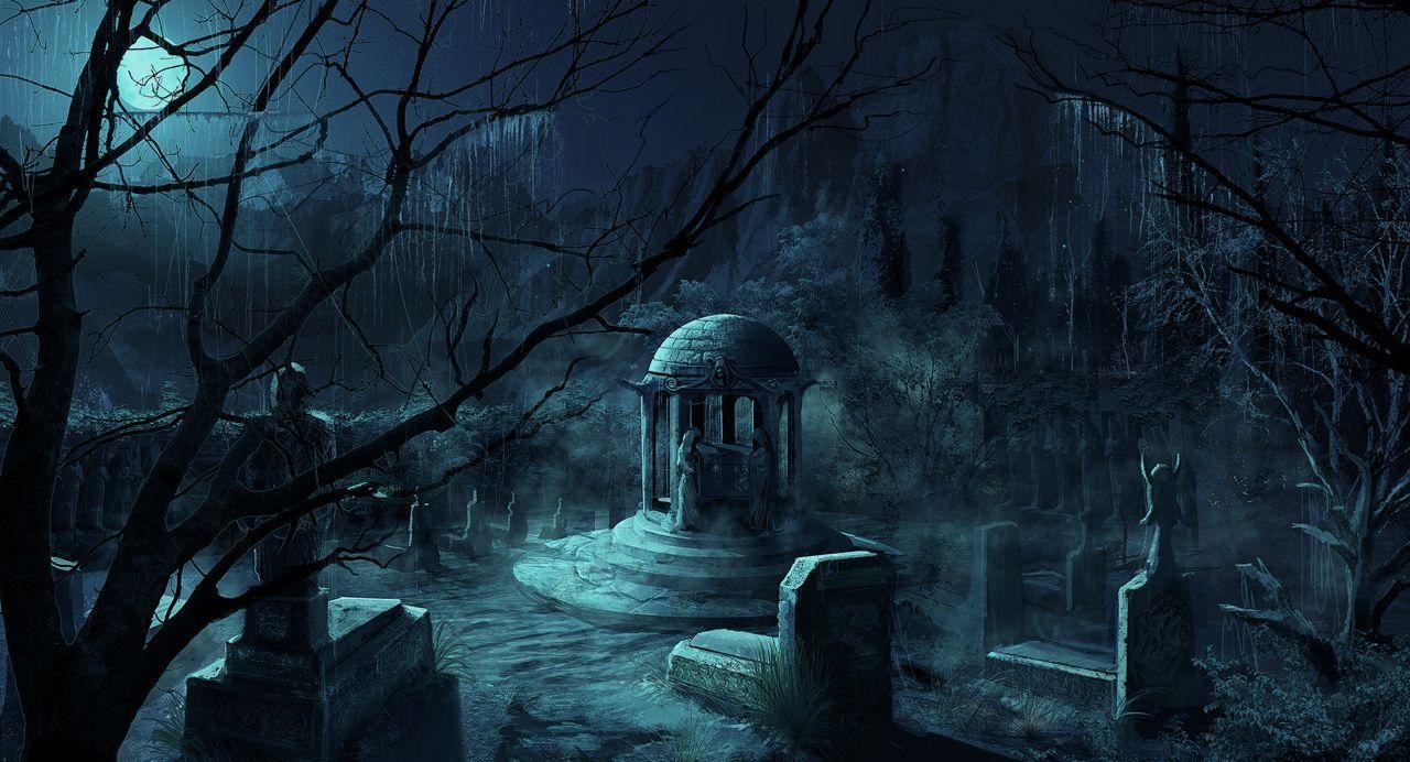 تصویر انیمه ای قبرستان گوتیک با درختان خشک شده در شب