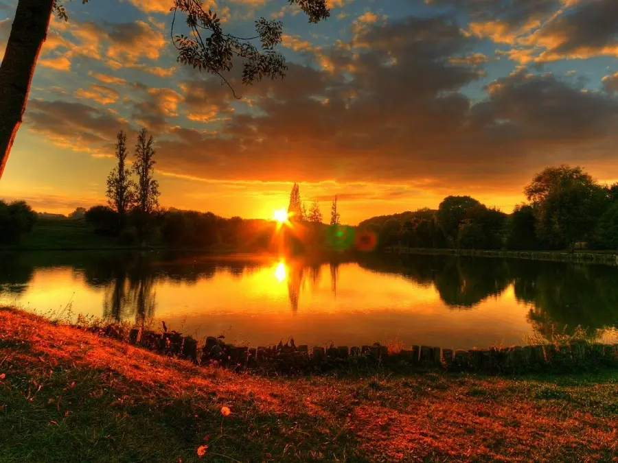 تصویر زمینه رمانتیک غروب دریاچه و انعکاس مناظر اطراف