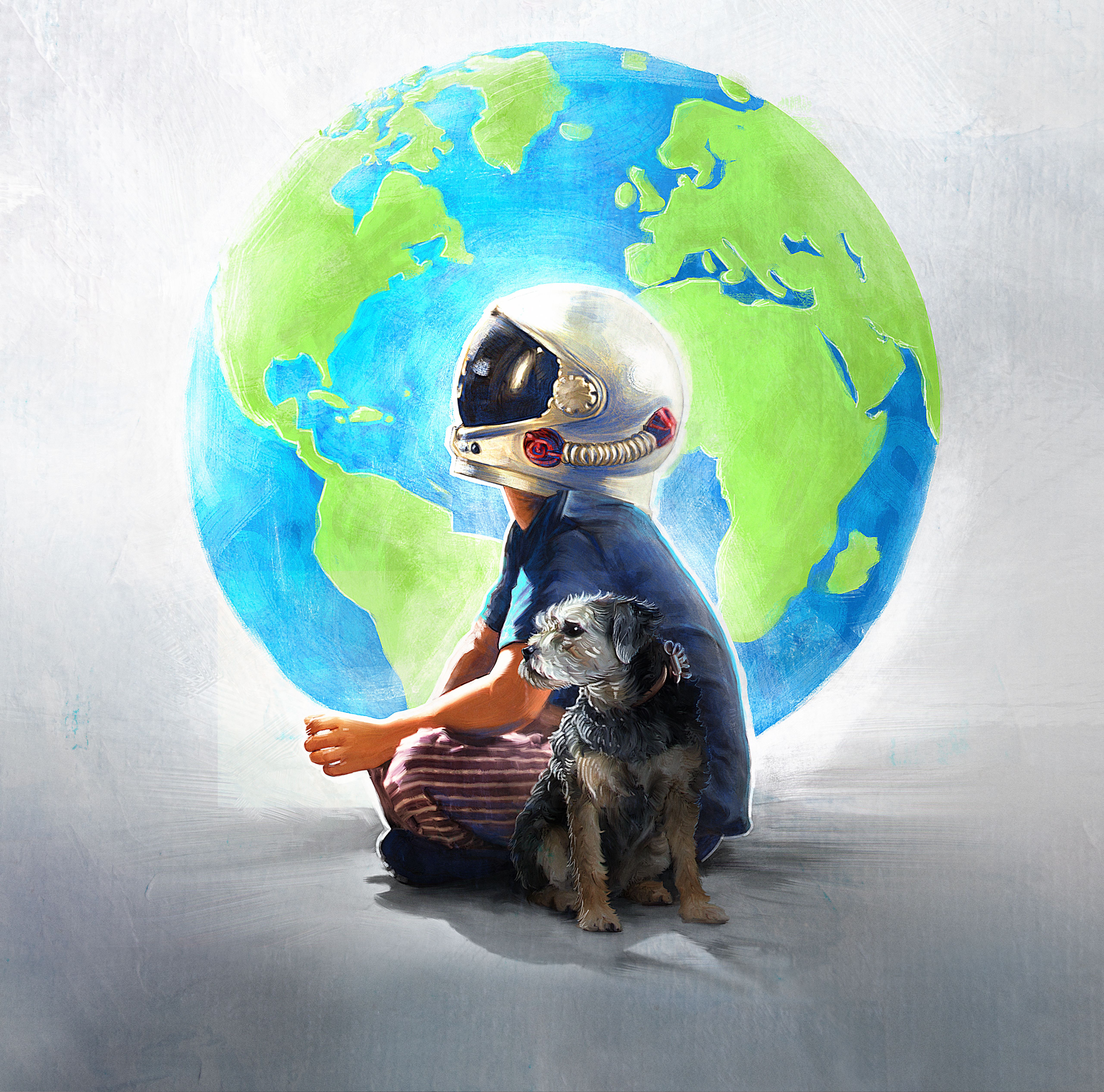 عکس دختر بچه با کلاه فضانوردی با زمینه کره زمین در کنار سگ کوچک