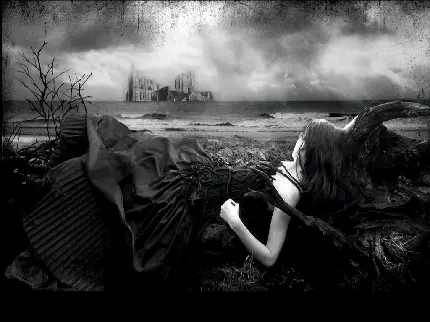 عکس زمینه گوتیک دختر و پسر بال دار غمگین در زمینه مشکی