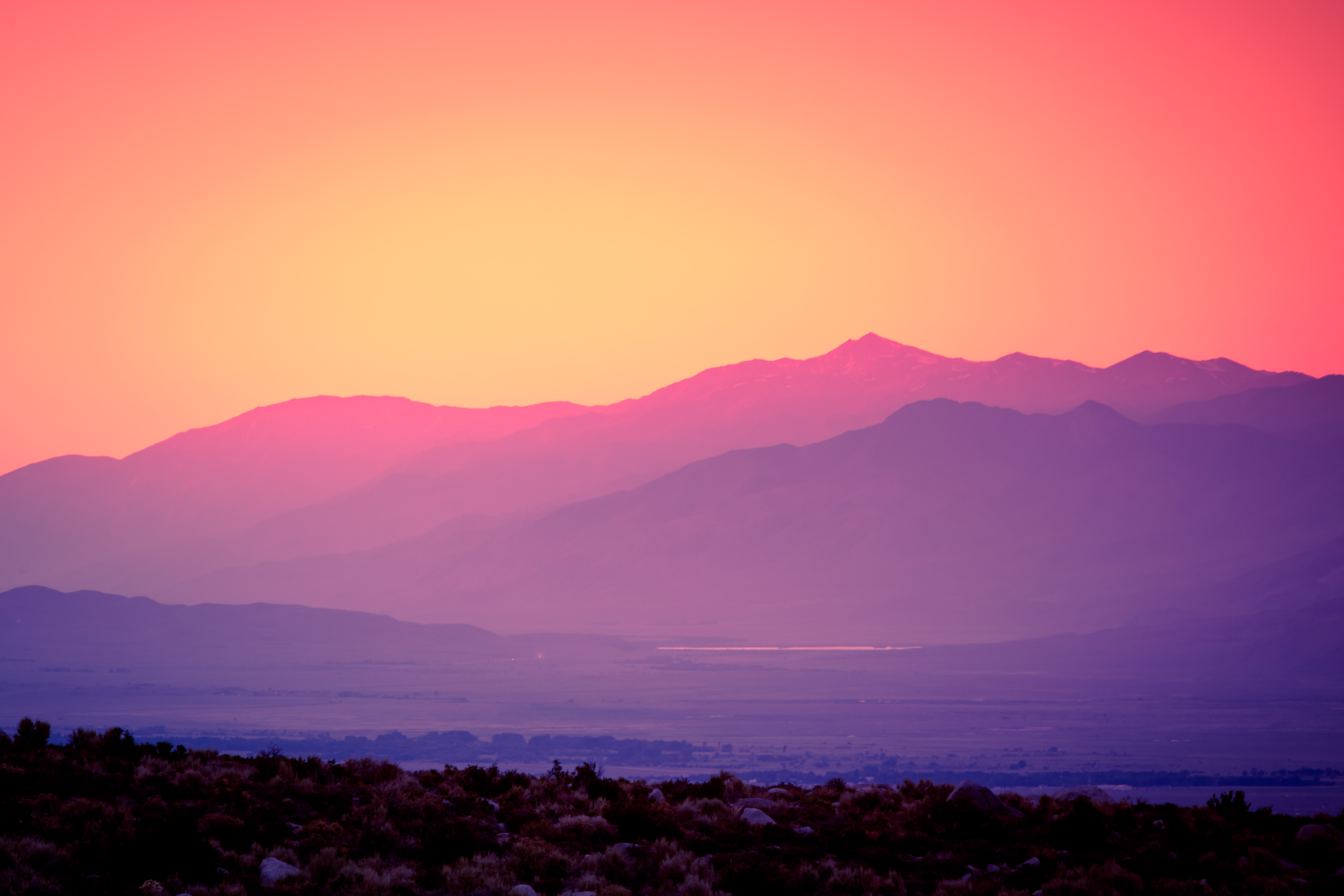 عکس غروب آفتاب با آسمان صورتی و کوهستان برای دانلود رایگان. این تصویر با ابعاد 5276x3517 و کیفیت عالی مناسب برای استفاده در والپیپر و تولید محتوا می باشد. طرحی طبیعی و زیبا برای علاقه مندان به تصاویر طبیعت.