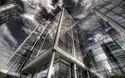 عکس بسیار حرفه ای از معماری صفحات شیشه ای ساختمان اداری با کیفیت 4K که طراحی مدرن را به نمایش می گذارد.