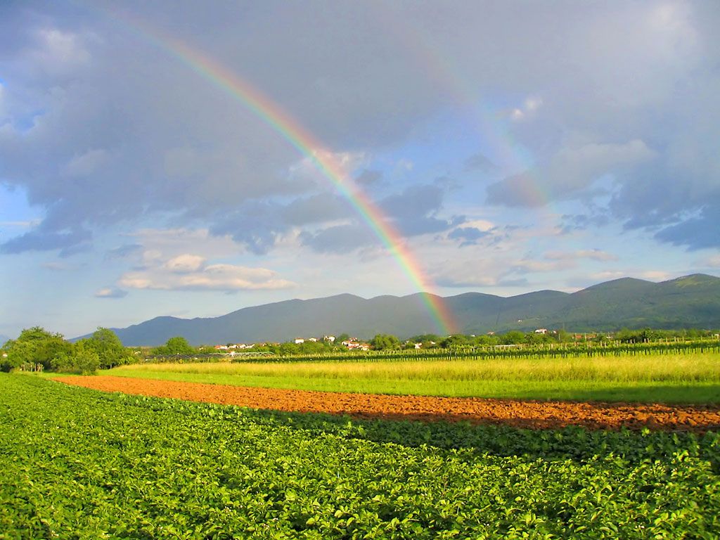 عکس و کاغذ دیواری زیبای کشتزار سرسبز در کنار رنگین کمان