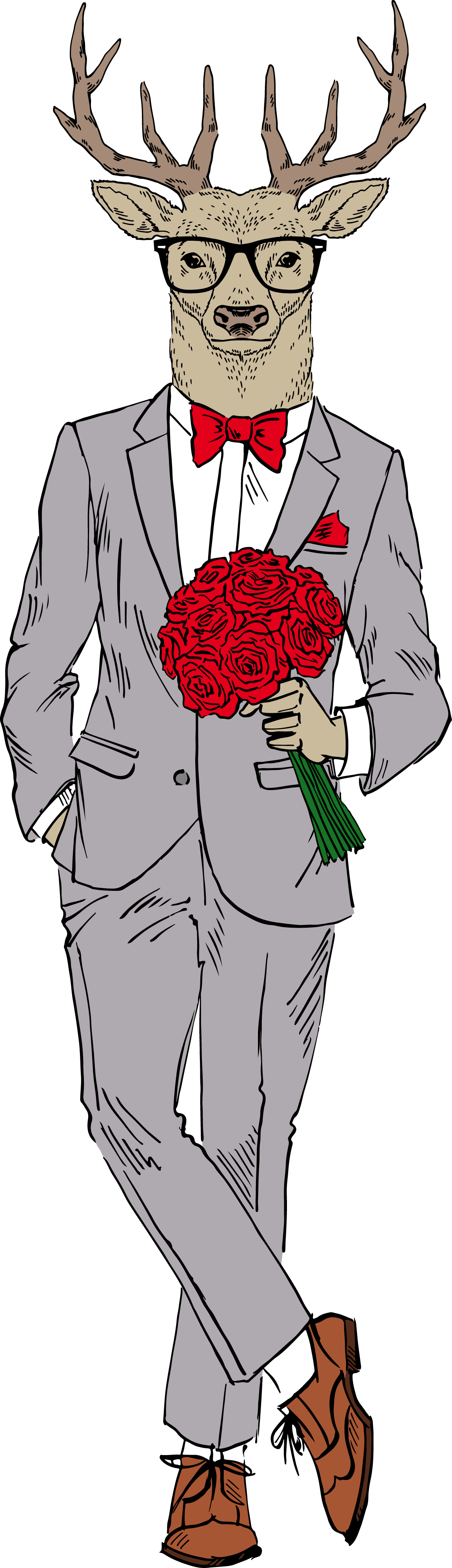 عکس کاراکتر گوزن جنتلمن با کت شلوار و دسته گل رز قرمز png